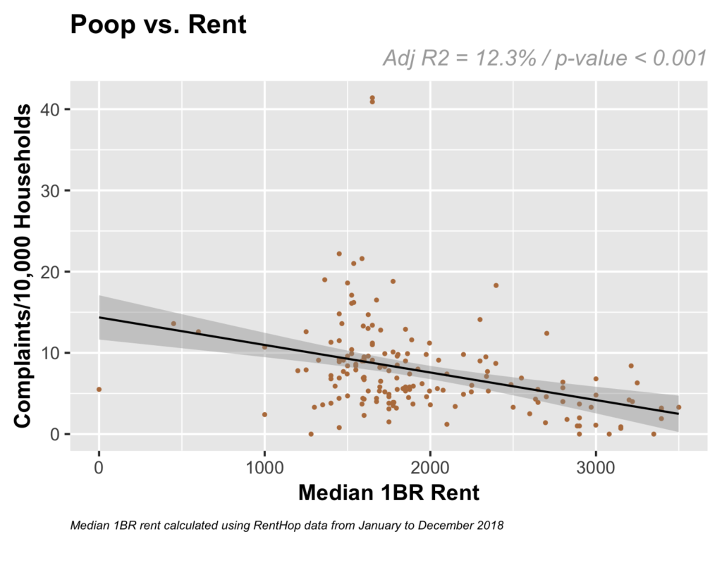 Want to lessen your chance of stepping in dog doo? Then move to one of New York City’s more expensive neighborhoods. RentHop found poop complaint rates decreased as the median rent of an area increased.