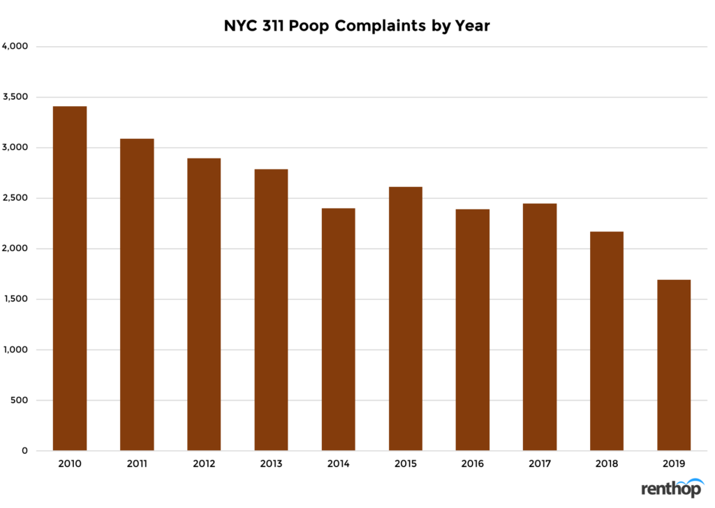 According to NY City Lens, the drop in poop complaints is primarily due to city residents turning to neighborhood blogs to call out repeat offenders and remind neighbors that failing to pick up after your dog is a violation of the city’s 41-year-old Pooper Scooper Law.