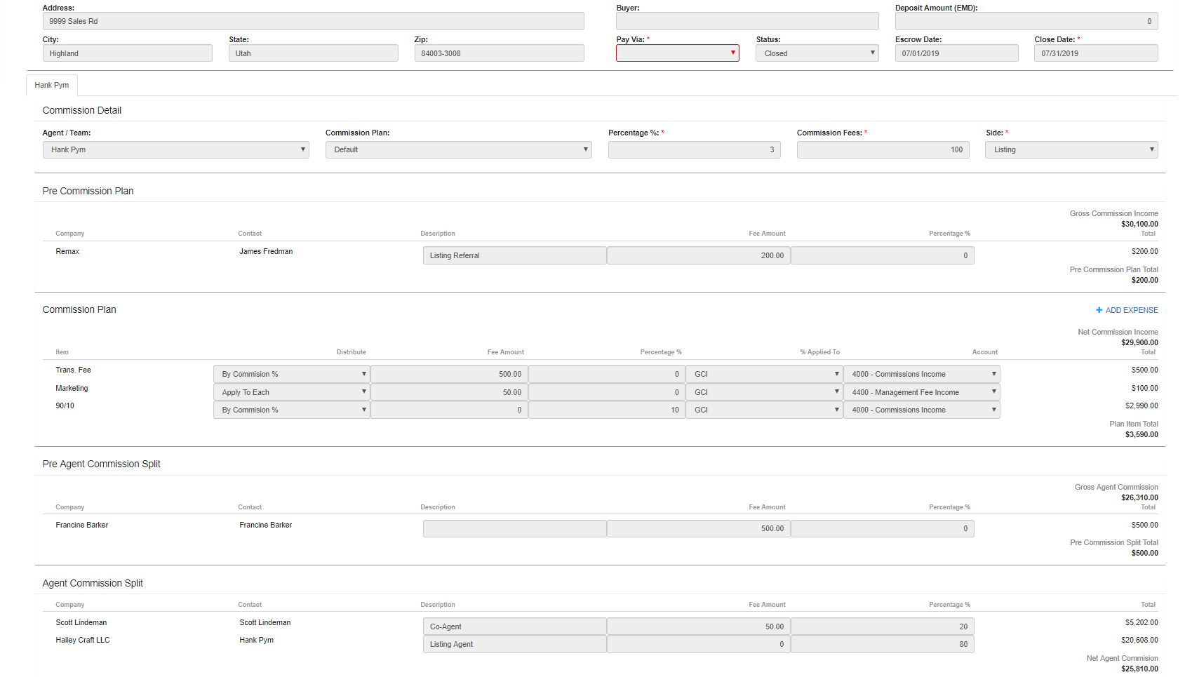 Other transaction details will pull from data entered at account setup, including commission structures, fees and limits, which are saved in perpetuity per agent, per team, throughout their tenure with the brokerage. Each can be adjusted as needed, too.